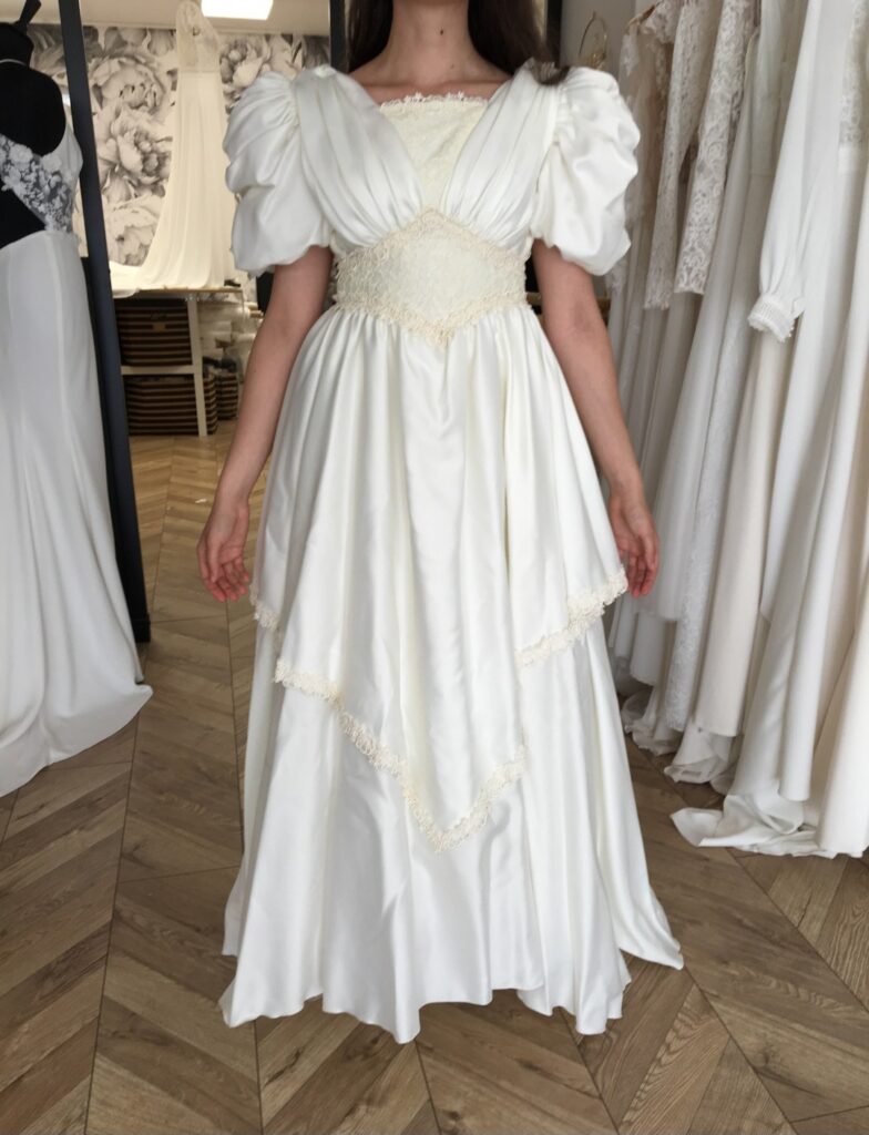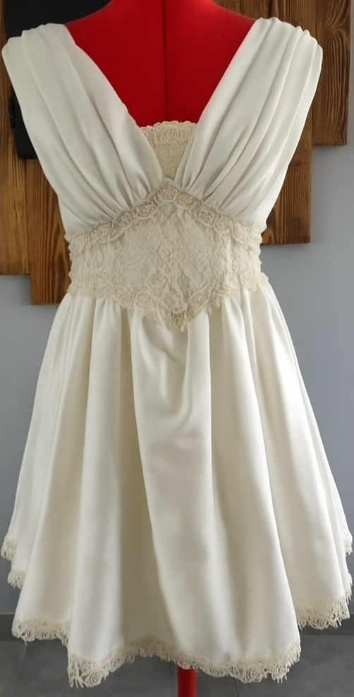 Cette cliente a souhaiter transformer la robe de sa mère en une robe plus moderne pour son mariage civil. J’ai donc raccourci la robe mais également retirer les manches, redessiné le décolleté devant et dos.